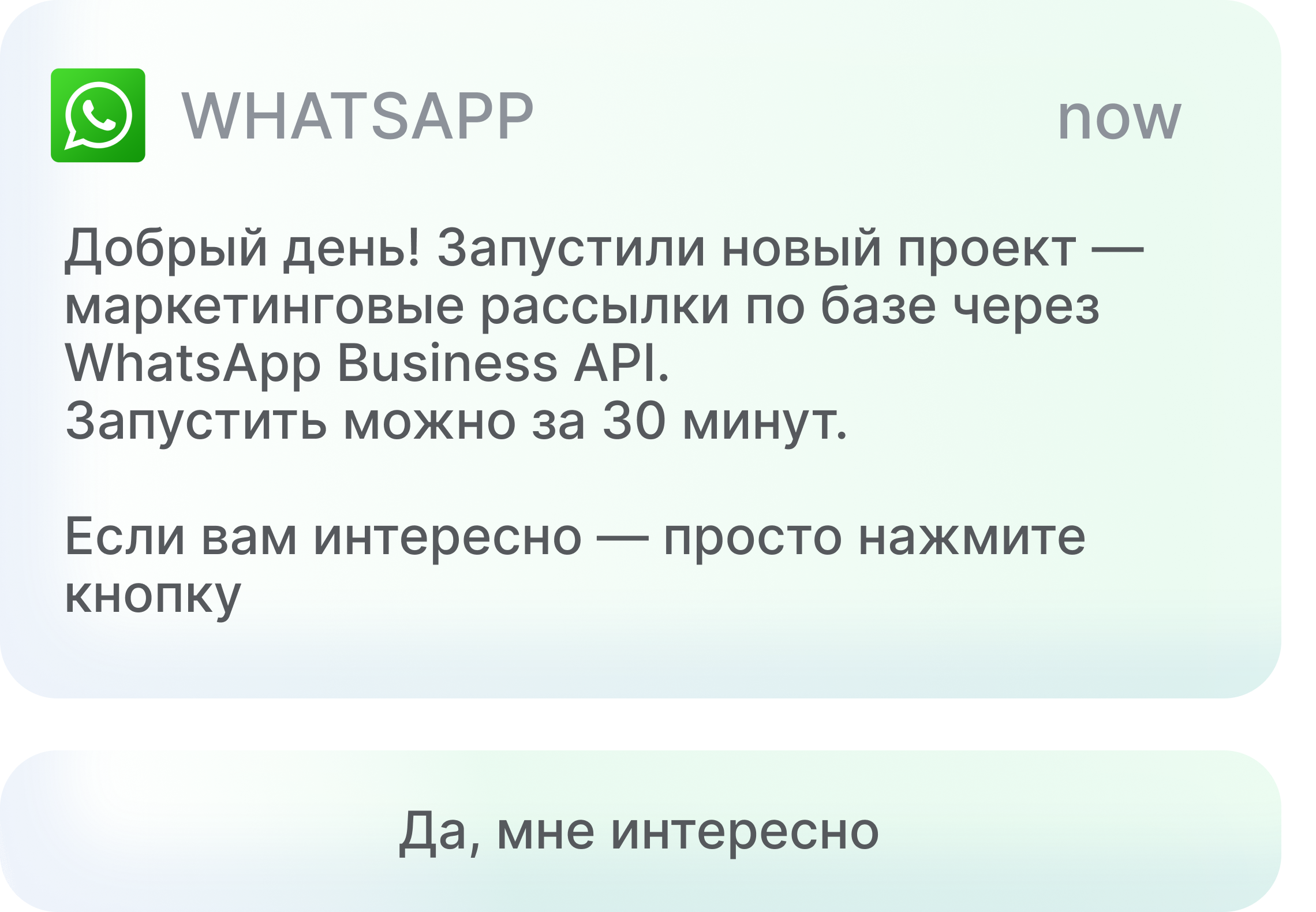 Envio em massa para todos os contatos de seu próprio banco de dados ou negócios de CRM com apenas alguns cliques. Informe os clientes sobre promoções, descontos e ofertas de bônus do WhatsApp sem o risco de bloqueio da conta.